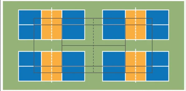 Un terrain de tennis standard permet d’implanter jusqu’à quatre terrains de pickleball.